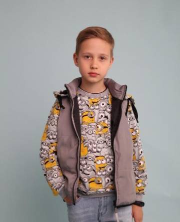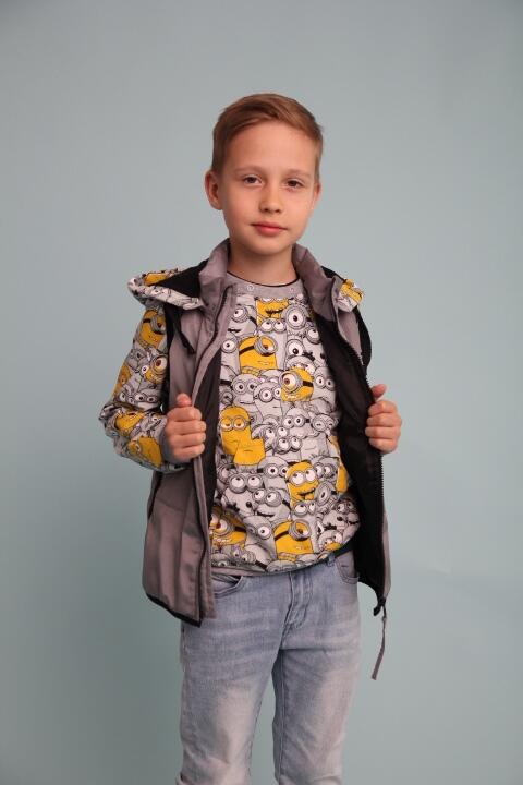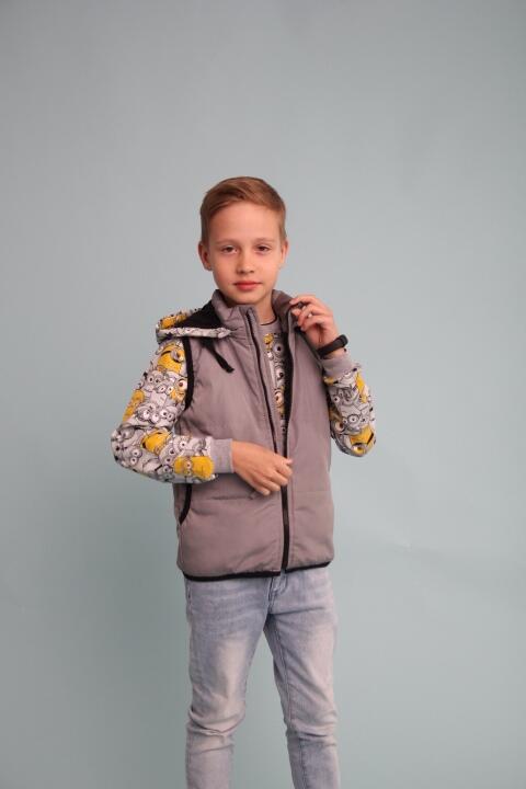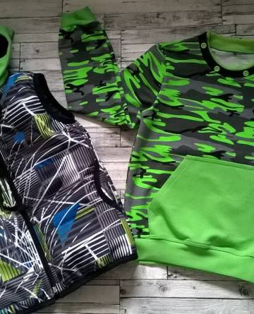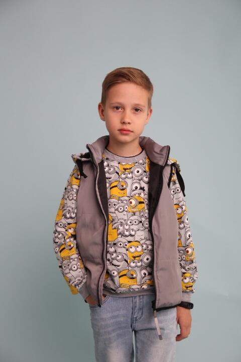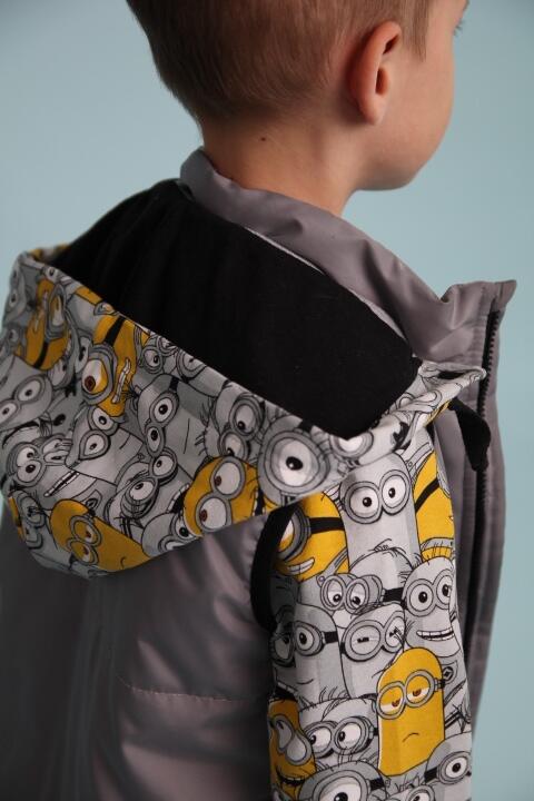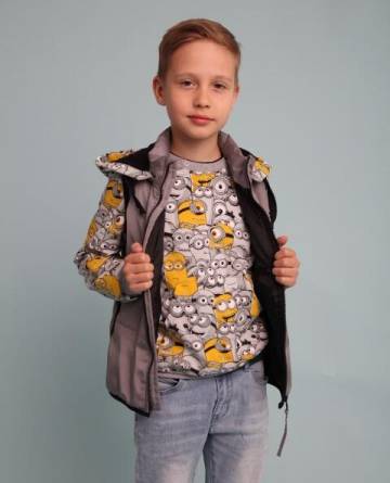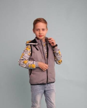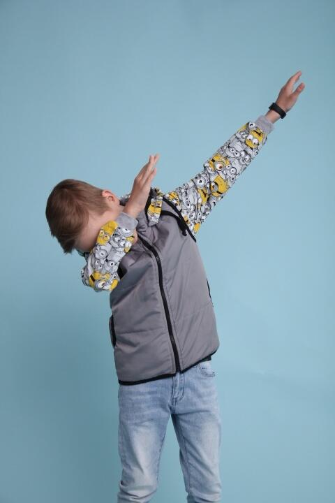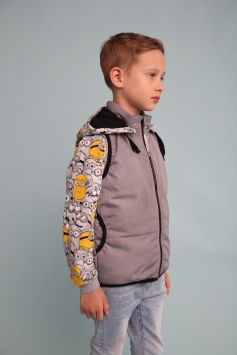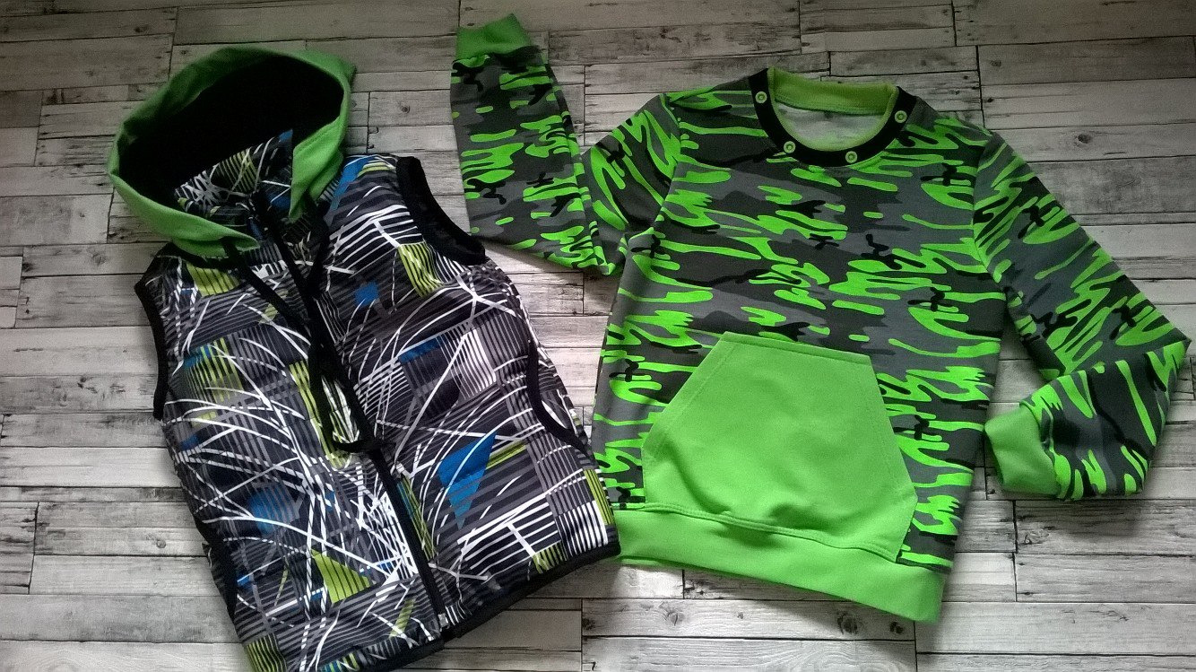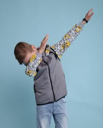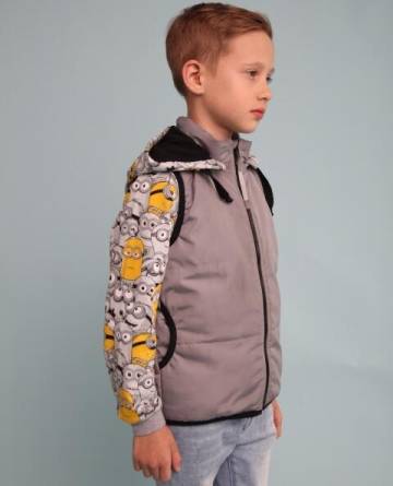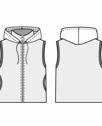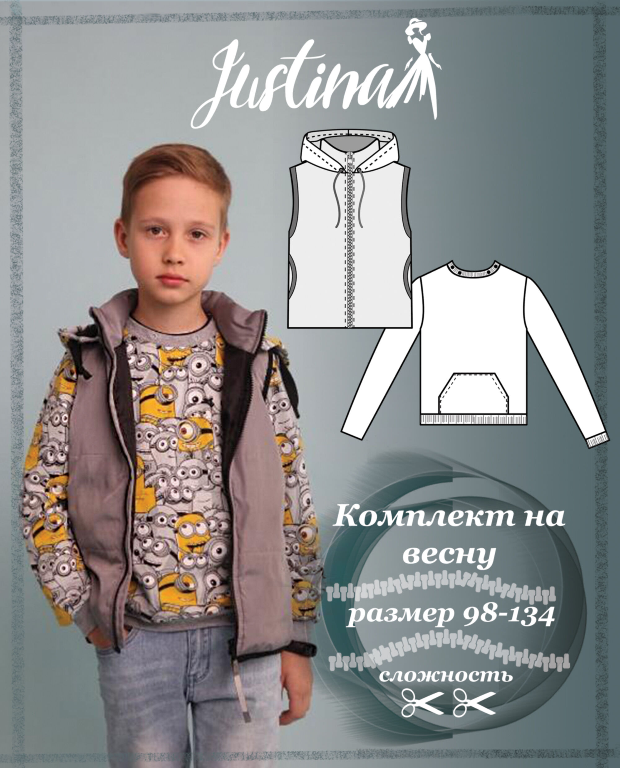 Предлагаем Вам сшить детский комплект на весну. Его уникальность в том, что капюшон можно пристегнуть как к джемперу так и к жилетке. Выкройка представлена размерным рядом с 98-134