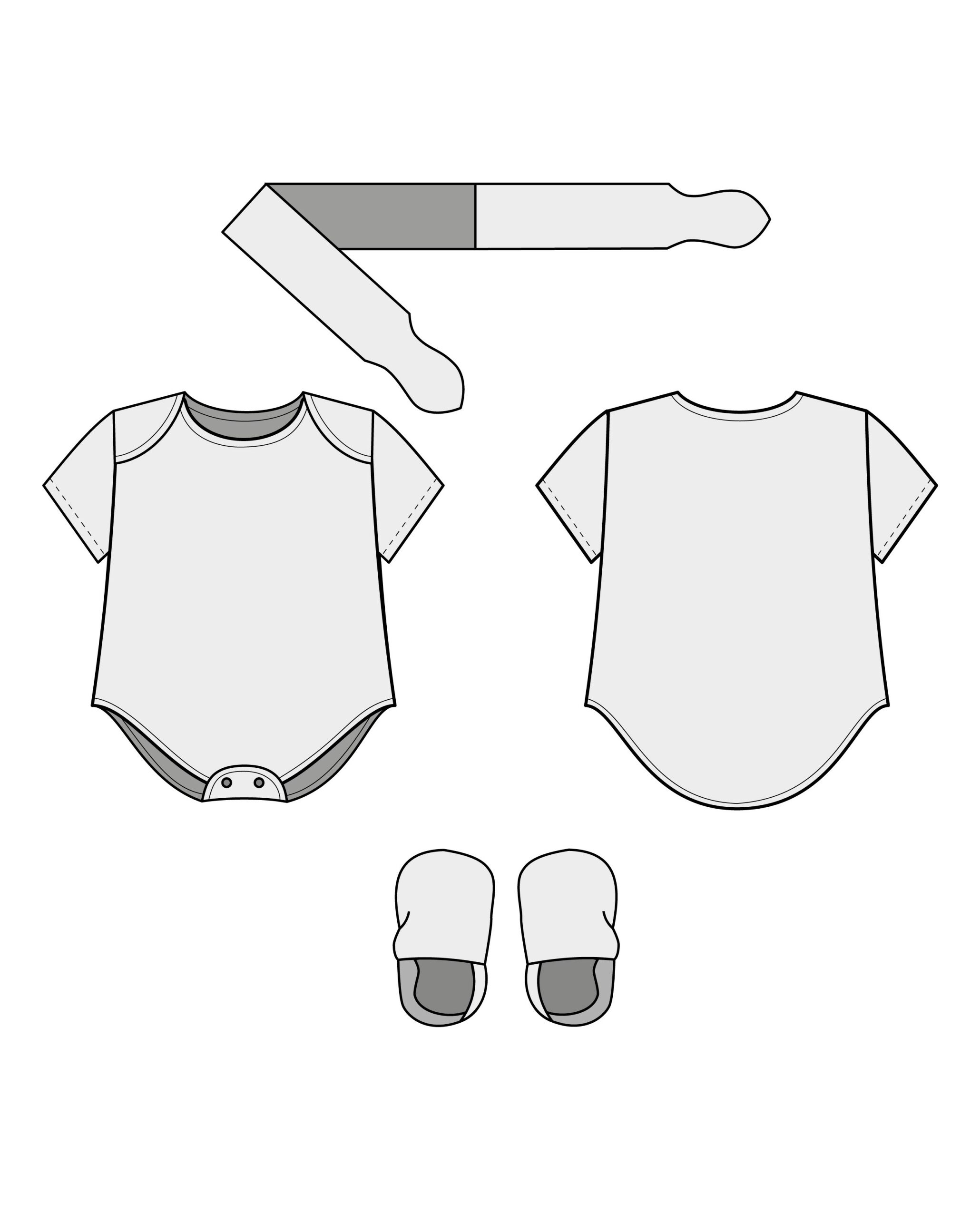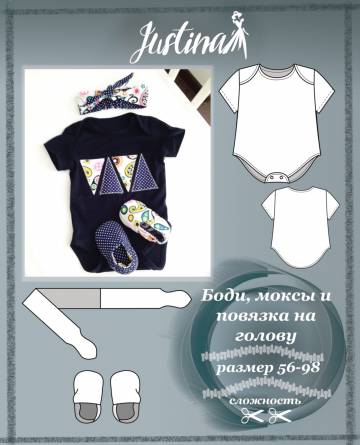 Выкройка представлена размерным рядом с 56-98. На мастер-классе вы научитесь шить боди, моксы и повязку на голову.